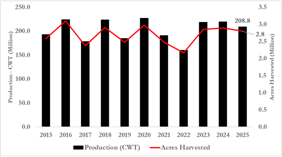 Figure 1. U.S. All Rice-Class Production and Acres Harvested (2015 – 2025F)