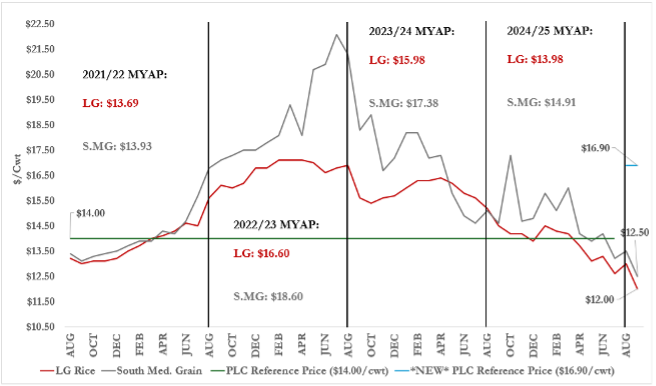 The September 2025 World Agricultural Supply and Demand Estimates (WASDE) report forecasts a 35% year-over-year increase in all rice-class beginning stocks. This increase in beginning stocks is almost entirely driven by the 93% year-over-year increase for long grain, the result of record yields across the southern region in 2024, with Arkansas averaging 169.8 bu/acre (UADA-CES, 2025). On the other hand, medium grain is forecasted to fall by 27.5%. The current outlook is for a slight rise in overall exports and a relatively minor decrease (~0.9%) in ending stocks relative to 2024/25 (USDA-AMS, 2025). Ending stocks are currently forecasted at 53.4 million cwt, compared to 2024/45, which was 53.9 million cwt. The USDA anticipates long-grain rice exports will reach 64 million cwt, a level that hinges on maintaining price competitiveness in global markets. As a result, farm prices for long-grain rice are forecast to decline to $12.00/cwt, while the prices for Southern medium & short-grain rice are forecast at $12.50/cwt (Figure 2). These expectations represent a severe decline from the 2024/25 marketing year, with long grain and Southern medium & short grain prices falling 14% and 18%, respectively. It’s worth noting that the effective reference price has increased from $14.00/cwt to $16.90/cwt for the 2025/26 marketing year (One Big Beautiful Bill Act, 2025). Figure 2 highlights this change, showing that current forecasts indicate a possible PLC payment under the new effective reference price.