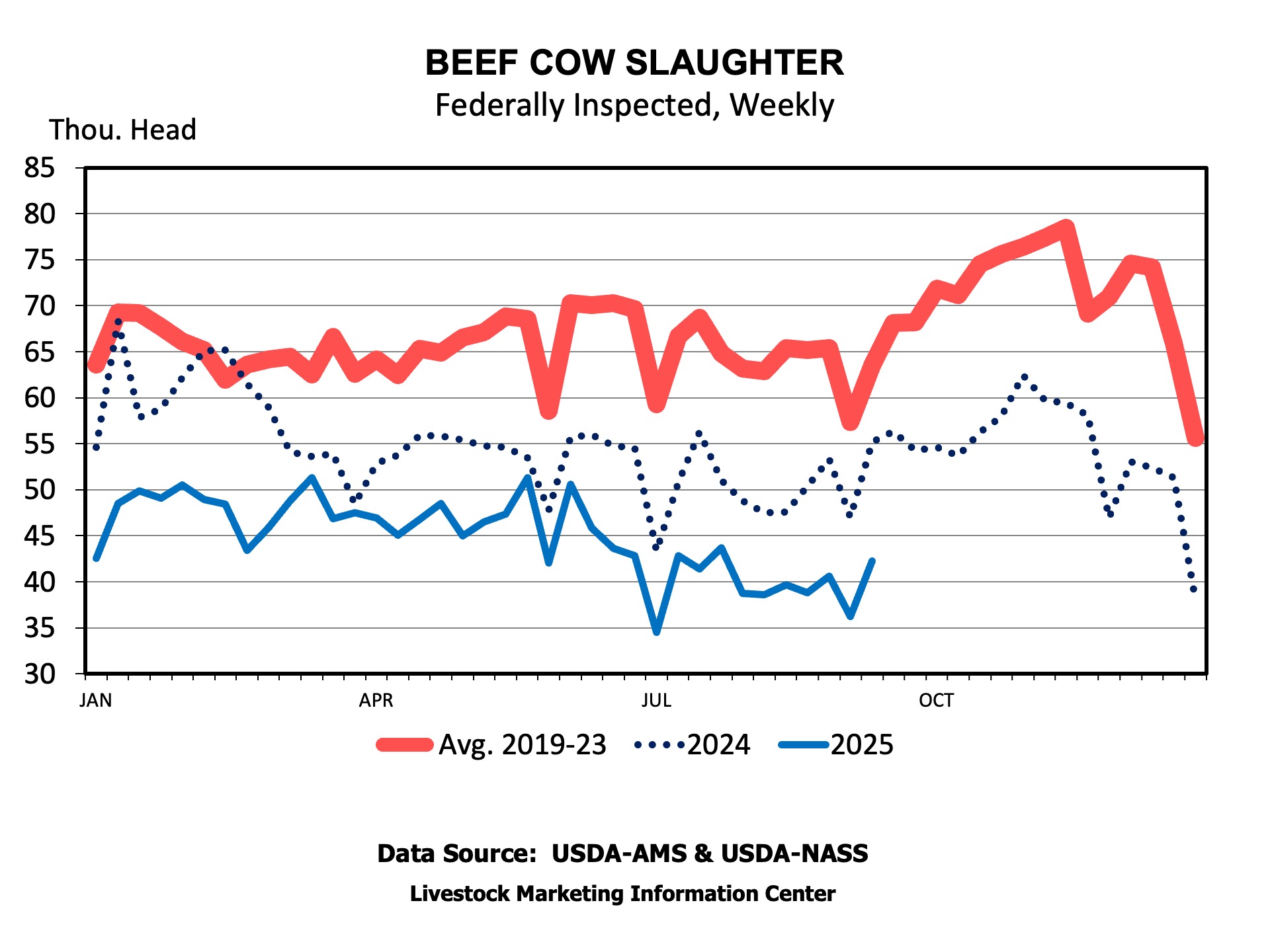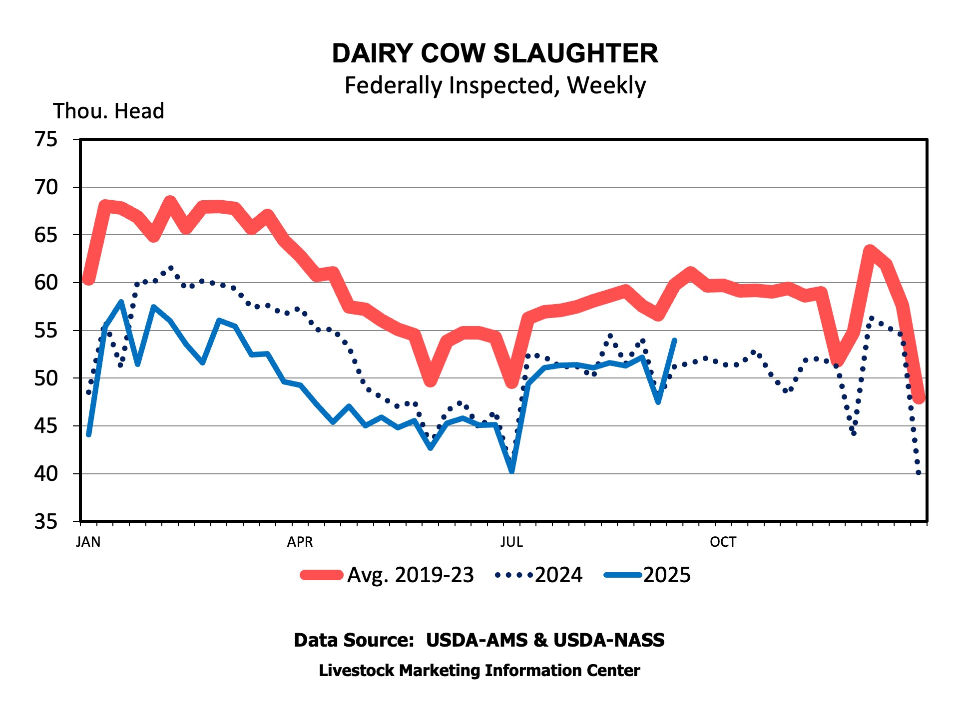Total cow slaughter includes dairy and beef cows. Beef and dairy cow slaughter each exhibit a different seasonality based on production patterns. Beef cow slaughter hits its peak in the Fall when most culling occurs around the country. Dairy cow slaughter peaks early in the first quarter of the year but, does increase in the Fall. The dairy herd has been expanding this year due to profits hitting over 9.5 million head on September 1, 2025, the most since 1993. As the herd has grown, culling has increased. For the year, total dairy cow slaughter is almost 19 percent smaller than the same period in 2024. But, in the last 2 months dairy cow slaughter is equal to last year. Beef cow slaughter remains well below last year but may begin to pick up seasonally in coming weeks. In total, cow culling has closed the gap compared to last year in recent weeks but, it has not been enough to weaken prices.
