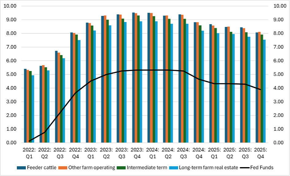 Figure 1. Agricultural Lending Rates by type and the Federal Funds Rate, 2022-2025